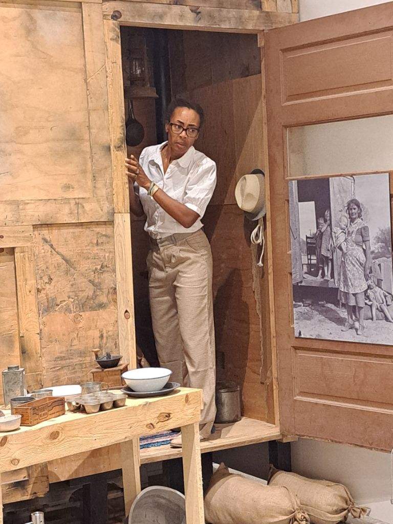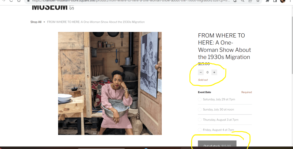 Our show is a composite of many people who migrated to Chandler, AZ in the 1930s during the Dust Bowl Migration. Using oral histories of Chandler residents, I developed a story about a woman, Margaret Renee Catherty, who arrives in Chandler from Oklahoma (inspired by another set of oral histories found in Geta LaSeur’s book, Not All Okies Are White: The Lives of Black Cotton Pickers in Arizona). Margaret Renee’s brother — her reason for coming to Chandler — is missing, and like so many others who have migrated, she must make her way amidst fear and uncertainty. In this story, she does so thanks to a helpful community made of many different individuals. The show travels throughout the exhibit and the audience follows.